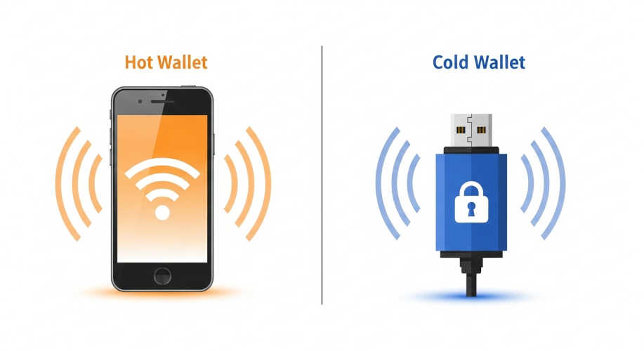 Mejores wallets para Ethereum: Diferencia entre hot wallet y cold wallet para Ethereum ilustrada en diagrama